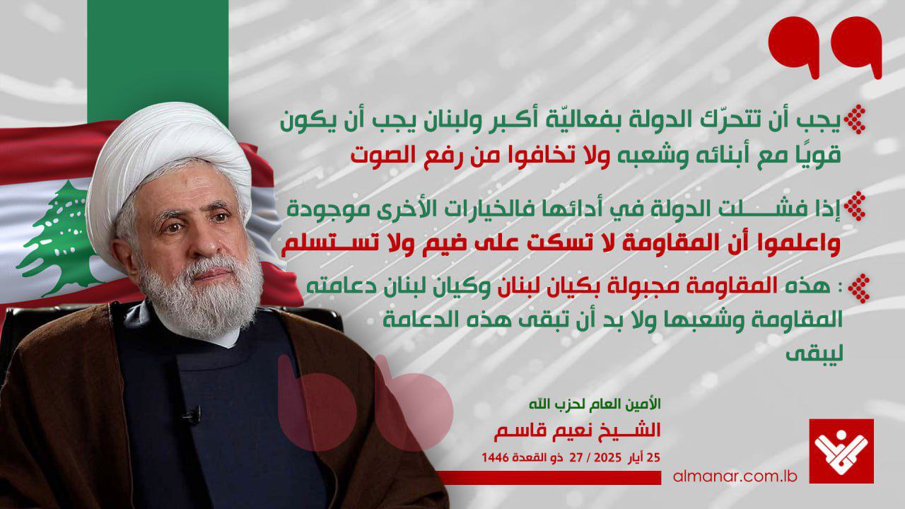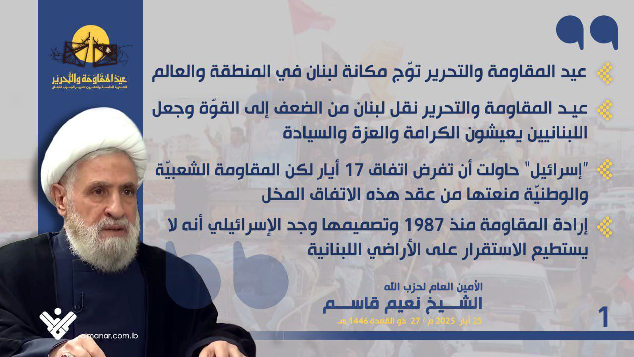 أبرز ما ورد في كلمة الأمين العام لحزب الله الشيخ نعيم قاسم بمناسبة عيد المقاومة والتحرير