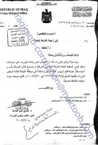 مكتب السيد رئيس الوزراء نوري المالكي بعث الى هيئة النزاهة العامة كتاباً بتاريخ 4/2/2007، موقعاً من قبل مدير مكتبه الدكتور طارق نجم عبد الله، يبين فيه موافقة رئيس الوزراء على تمليك الدور السكنية العائدة لشركة الموانئ العراقية وبضمنها الدار المذكورة.