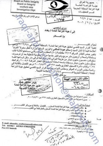 وقد استفسرت هيئة النزاهة في المنطقة الجنوبية من هيئة النزاهة في بغداد عن هذا الموضوع بكتاب لها بتاريخ 10/9/2006 التي احالت الامر بدورها الى مكتب السيد نوري المالكي.