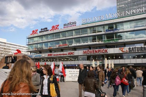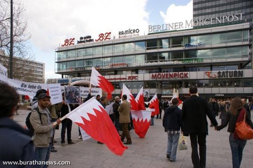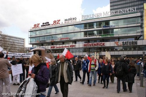 تلبية لنداء نصرة الشعب البحريني المُحتل من قبل مرتزقة ما يسمى بدرع الجزيرة بقيادة كيان آل سعود وتواطىء كيان آل خلفية الذين سمحوا للقوات الخليجية الغازية بإحتلال البحرين وقتل أبناء شعبها الأعزل الذين انتفضوا من أجل عزتهم وكرامتهم المنتهكة وحريتهم المسلوبة وللمطالبة بحقوقهم المشروعة في العيش بأمن وسلام، إعتصم العشرات من أبناء الجالية العربية والإسلامية في وسط برلين ( السنتر) حاملين اعلام البحرين وصور وشعارات ولافتات تندد بالإحتلال السعودي الخليجي،