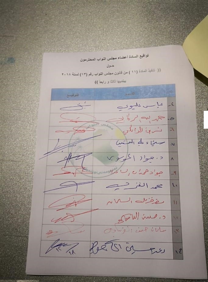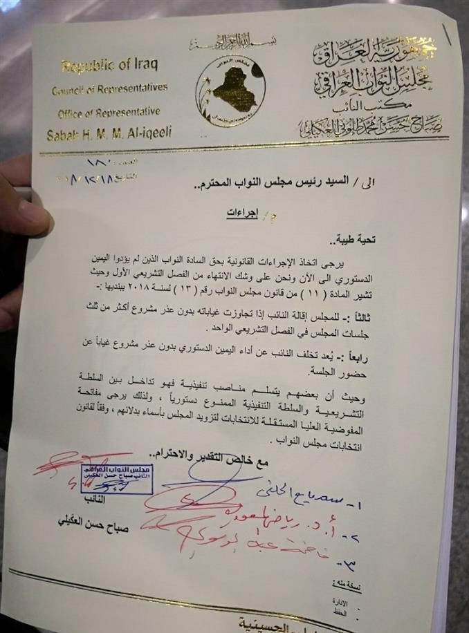 جمع عدد من النواب، قبيل انعقاد جلسة البرلمان الثلاثاء (18 كانون الأول 2018)، تواقيع لإقالة النواب الذين لو يؤدوا اليمين الدستورية، بينهم رئيسا الحكومة السابقين، حيدر العبادي، ونوري المالكي.