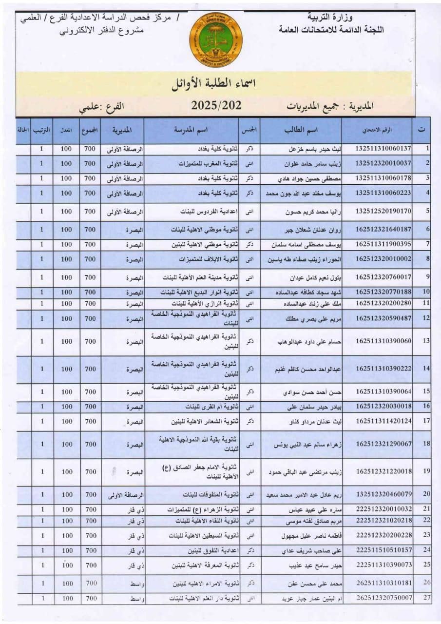 أعلنت وزارة التربية، اليوم السبت (26 تموز 2025)، عن أسماء الطلبة الأوائل على العراق للفرع العلمي.