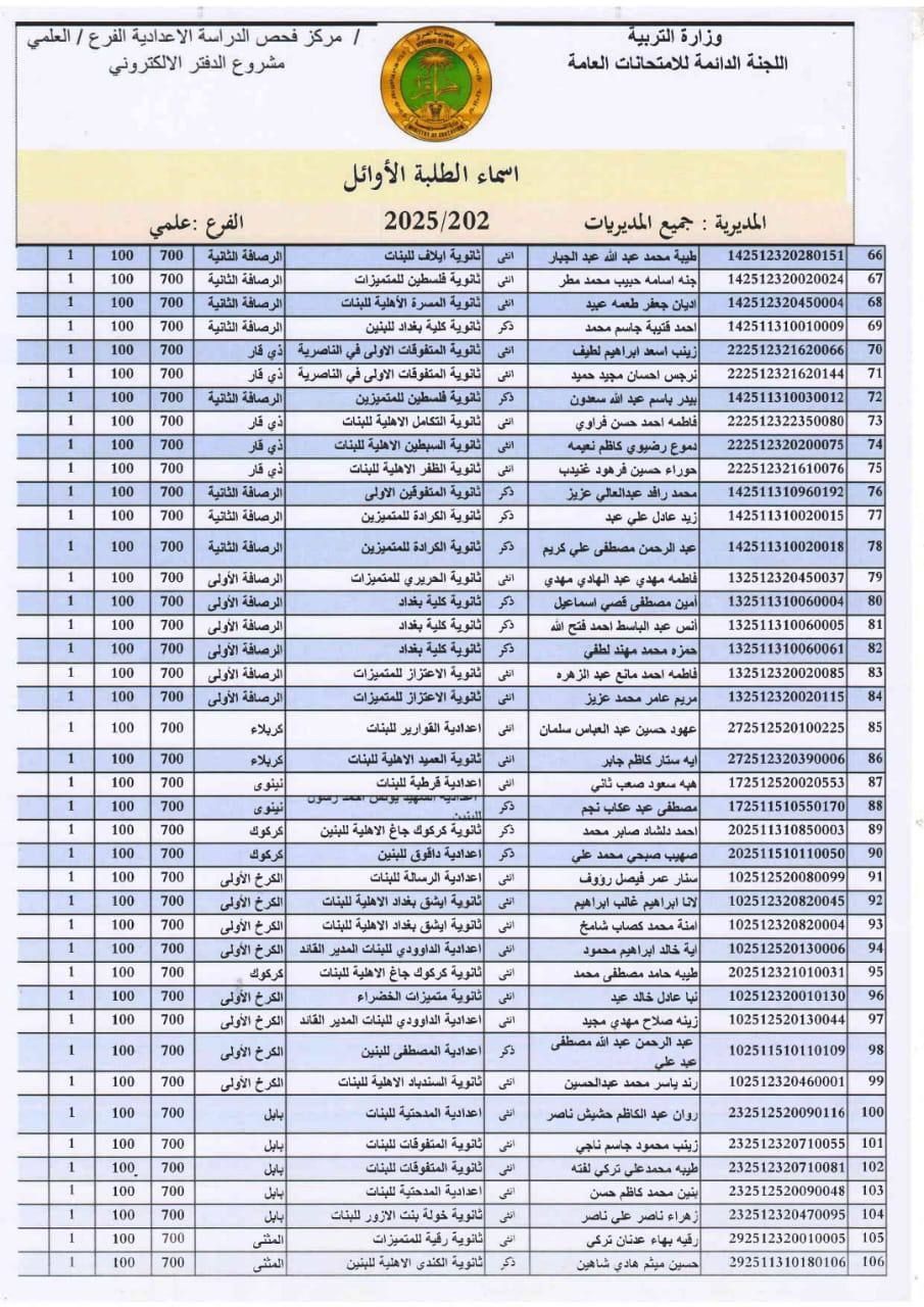 وبحسب القوائم فأن وزارة التربية نشرت 171 اسم طالب في الفرع العلمي ولجميع مديرياتها.