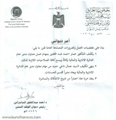وأضاف:أن "الدائرة المذكورة في الوقف السني لم يعين فيها مديرا عاما منذ سنوات وبالتالي فان منصب معاون المدير العام سيكون هو المسؤول عن أهم مرافق الوقف السني. "