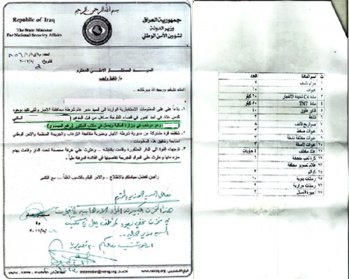نشرت وثيقتان تثبتان تورط موظف من محافظة الانبار يعمل في مكتب وزير المالية رافع العيساوي بحيازة كواتم للصوت وعبوات ناسفة اضافة الى رمانات متفجرة ومواد شديدة الانفجار واخرى محظورة تستخدم في تنفيذ العمليات الارهابية .