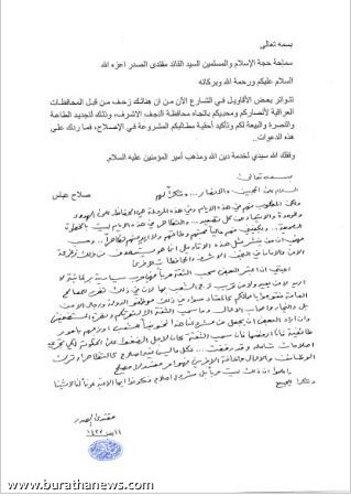 وقال الصدر في بيان صدر عن مكتبه ان "المطلوب في هذه المرحلة هو التهدئة وعدم التصعيد "، مبينا ان "التظاهر في هذا الوقت ليس خطوة صحيحة لان الداعين الى تلك التظاهرات قد يستهدفون زعزعة الأمن في البلاد".