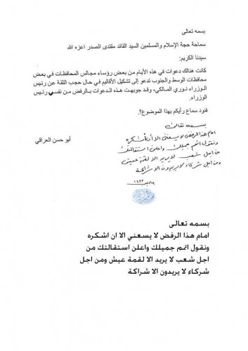 من جانب اخر دعا السيد الصدر رئيس الوزراء المالكي الى الاستقالة ، جاء ذلك ردا على سؤال حول رفض المالكي دعوات البعض بالاعلان عن الاقاليم في حال سحب الثقة عن الحكومة