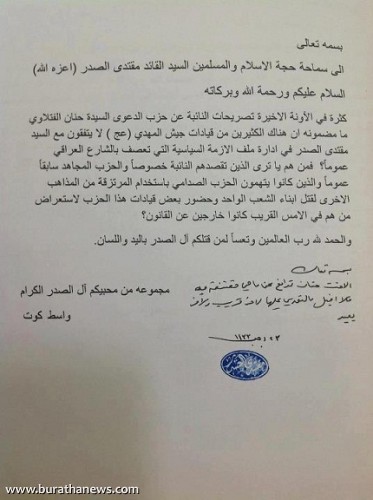 جاء ذلك على خلفية التصريحات التي أدلت بها بشأن عدم اتفاق قيادات في الجيش المهدي معه في إدارة العملية السياسية.وقال السيد الصدر في إجابة على سؤال لأحد أتباعه بشأن تصريحات للفتلاوي قالت فيها (إن الكثيرين من قيادات جيش المهدي لا يتفقون مع الصدر في إدارة ملف الأزمة السياسية التي تعصف بالشارع العراقي عموماً)، إن "الأخت حنان تدافع عما هي مقتنعة به".وأضاف الصدر "لا أقبل بالتعدي عليها لا من قريب ولا من بعيد".وكان عدد من وسائل الإعلام نقل عن النائبة الفتلاوي قولها إن هناك العديد من القيادات في الجيش المهدي يخالفون رؤية زعيم التيار الصدري لحل الأزمة السياسية، في إشارة إلى موقفه الداعم لسحب الثقة من رئيس الحكومة نوري المالكي.