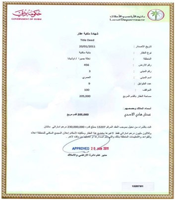 وتبين الوثيقة التي نشرها موقع قراءات ان العقار يقع ضمن مجمع سكني في العاصمة الاماراتية دبي وتبلغ مساحة المنطقة العقارية205000متر مربع مقاسة بالقدم وتتالف البناية من 9 طوابق .