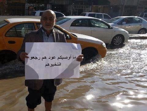 وعبر صور نشرت على (فيس بوك) تظهر فيضانات في معظم الشوارع والأزقة والمنازل ، منها ممزوج بالمياه الثقيلة ، يعبر العراقيون عن مدى سخريتهم من إمكانيات الدوائر البلدية والخدمية من سحب تلك المياه ، فيما يرى أخرون ان الحكومة تطلق الشعارات فقط ، عبر مؤسسات إعلامية تمثل الحكومة ، ولا حقيقة على أرض الواقع .