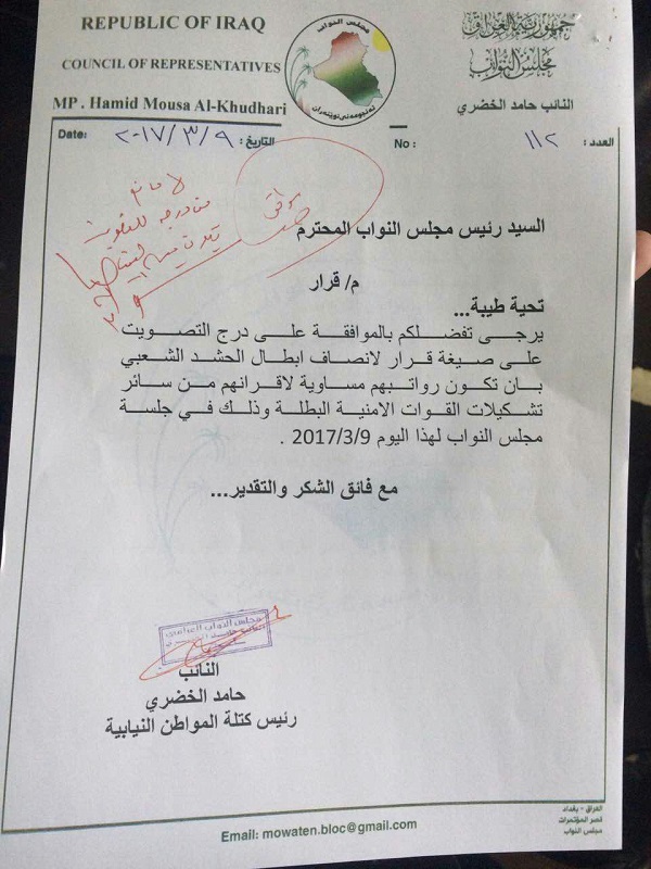 وقال رئيس كتلة المواطن النائب حامد الخضري في بيان صحفي اليوم " قدمنا اليوم مقترحا بانصاف ابطال الحشد الشعببي لمطالبة مجلس النواب باصدار قرار يلزم الحكومة بالعمل وفق البند الرابع من الامر الاداري 91/ 2016 ، الذي ينص على ان يتم تكييف منتسبي ومسؤولي وآمري هذا التشكيل وفق السياقات العسكرية من تراتيبه ورواتبه ومخصصاته وعموم الحقوق والواجبات والذي تضمنته المادة 1/ ثانيا من قانون الحشد الشعبي الذي شرعه المجلس بجلسته 32 المنعقدة بتاريخ 26-11-2016 ".