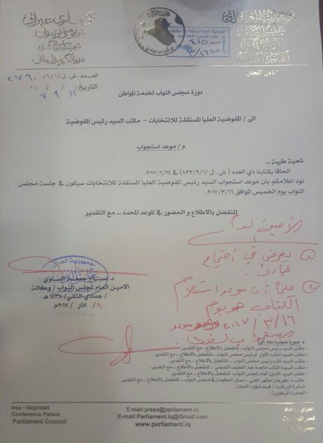 أفاد مصدر مسؤول في المفوضية العليا المستقلة للانتخابات، الخميس،، إن "كتاب إستجواب المفوضية الذي ورد من مجلس النواب، والذي تم تحديده بتاريخ اليوم الخميس الـ١٦ من اذار الحالي، هو موعد للاستجواب، وصل بنفس اليوم الذي تم تحديد الموعد فيه".