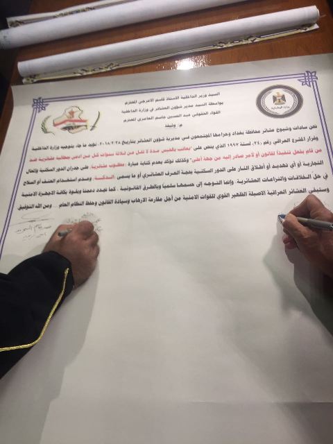 وقعت وزارة الداخلية والعشائر، الاربعاء، وثيقة عهد وشرف بعدم كتابة اي عبارات تهديد على جدران المنازل.