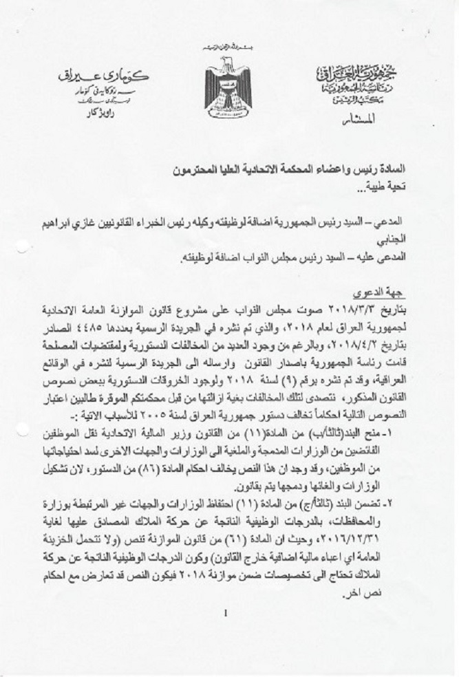 رفع رئيس الجمهورية فؤاد معصوم ، اليوم الاربعاء ، دعوى قضائية ضد رئيس البرلمان سليم الجبوري بسبب مخالفات تضمنتها الموازنة العامة لعام 2018.