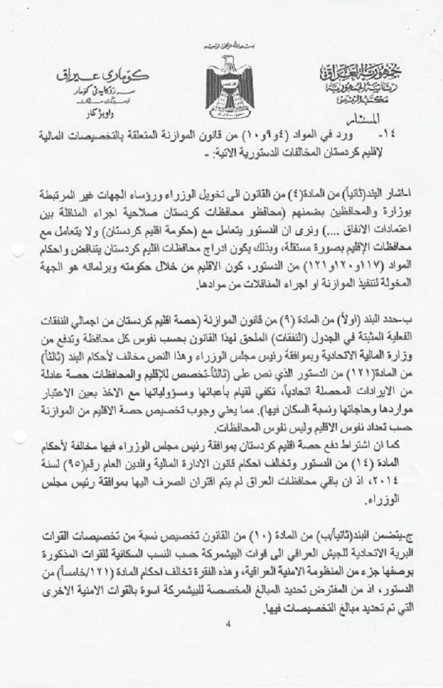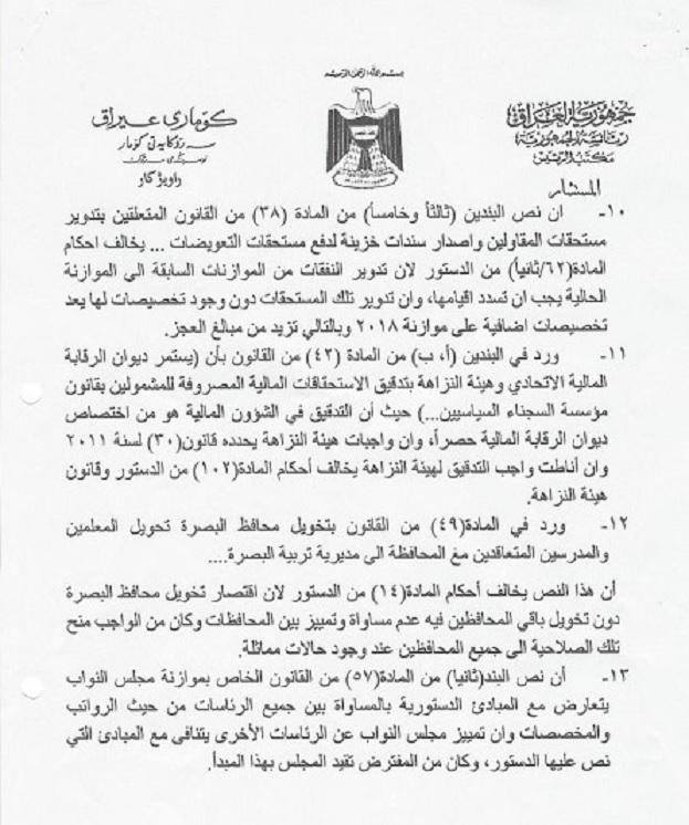 وحددت الوثائق، تلك الخروقات في موازنة 2018، وطلبت من المحكمة الاتحادية النظر فيها واعتبارها نصوص تخالف الدستور.