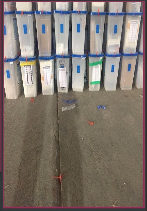 وتظهر الصور أقفال الصناديق مرمية على الارض وهي تالفة، كون هذه الاقفال تستخدم لمرة واحدة فقط ولا يمكن فتحها إلا بإتلافها، مما يدلل على فتح تلك الصناديق بهدف إبطالها بسبب عدم تطابق ارقام الأقفال مع أرقام الصناديق، عند اجراء العد والفرز اليدوي.