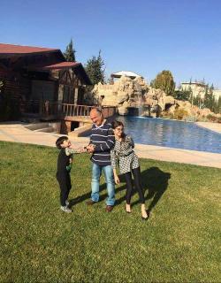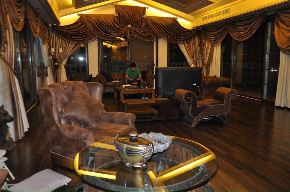 واضاف " والان اخذكم الى المنزل الذي اعيش فيه مع اسرتي في شارع السفراء بدمشق والذي يتربع على عشرة الاف متر مربع ويتكون من اربعة ادوار تختلف عن بعضها من حيث الطراز والاستعمال، ويضم القصر مسبحين وبحيرة لاسماك الزينة وحدائق غناء ".