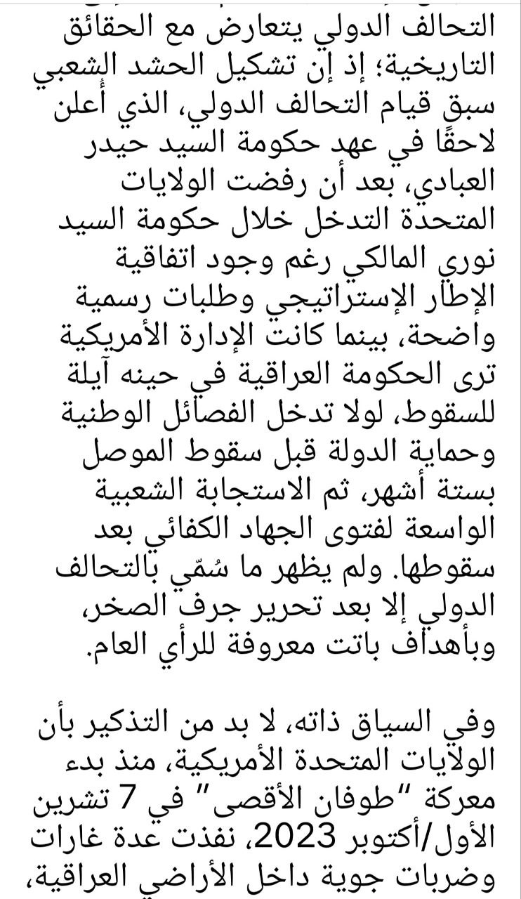 ثانيًا: بشأن القول إن الحشد الشعبي كان جزءًا من مواجهة داعش بدعم ووجود التحالف الدولي