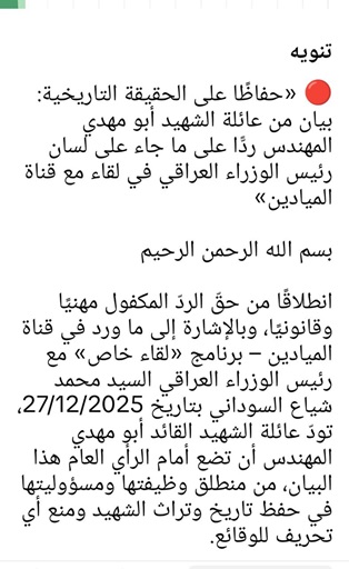 انطلاقًا من حقّ الردّ المكفول مهنيًا وقانونيًا، وبالإشارة إلى ما ورد في قناة الميادين – برنامج «لقاء خاص» مع رئيس الوزراء العراقي السيد محمد شياع السوداني بتاريخ 27/12/2025، تودّ عائلة الشهيد القائد أبو مهدي المهندس أن تضع أمام الرأي العام هذا البيان، من منطلق وظيفتها ومسؤوليتها في حفظ تاريخ وتراث الشهيد ومنع أي تحريف للوقائع.