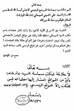 مكتب الامام المفدى السيد علي السيستاني ينفي علاقته بالصفحة الموثقة التي اطلقت على موقع التواصل الاجتماعي فيس بوك