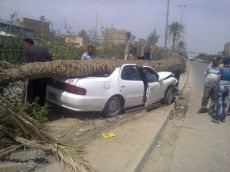 حادث اصطدام مروع وسط كربلاء اسفر عن قلع شجرة من تحت الارض وجرح شخصين