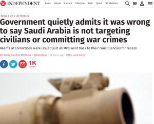 كتب “جون ستون” و”كارولين مورتايمر” مقالا في صحيفة “الأندبندنت” البريطانية الجمعة (22 يوليو 2016) بعنوان “الحكومة تعترف بهدوء انها أخطات بقولها أن السعودية لم تستهدف المدنيين ولم ترتكب جرائم حرب” في اليمن.