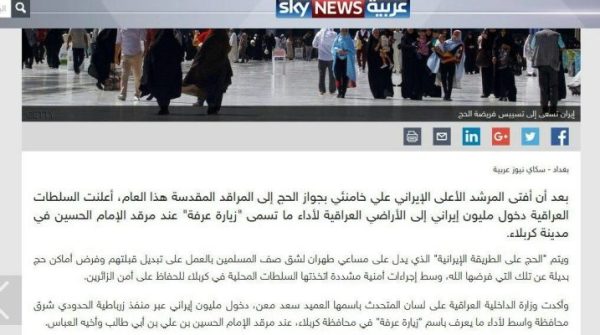 وفي هذا الصدد نشر موقع قناة "سكاي نيوز" العربية التابعة لدولة الامارات التي تشارك السعودية في العدوان الغاشم على الشعب اليمني، خبرا مفاده ان مسؤولين عراقيين أعلنوا ان العراق استقبل نحو مليون زائر ايراني للمشاركة في زيارة عرفة .