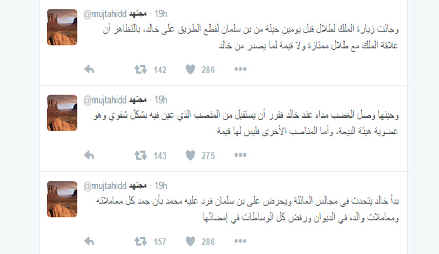 كشف المغرد السعودي الشهير بـ"مجتهد" في موقع التواصل الاجتماعي "تويتر"، عن الاسباب التي "تثير الدهشة" ودفعت خالد بن طلال الى الاعلان عن استقالته من جميع مناصبه.