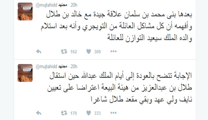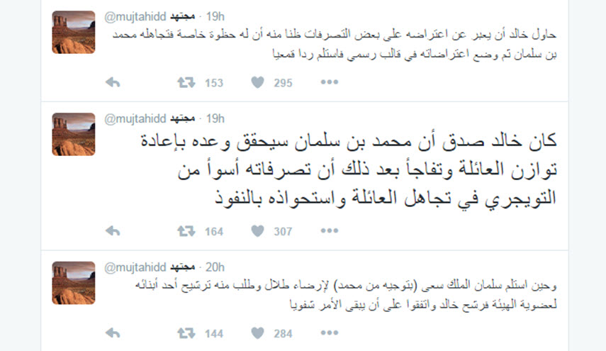 وحين استلم سلمان الملك سعى (بتوجيه من محمد) لإرضاء طلال، وطلب منه ترشيح أحد أبنائه لعضوية الهيئة فرشح خالد واتفقوا على أن يبقى الأمر شفويا.
