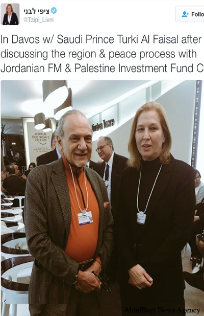 نشرت وزيرة الخارجية الصهيونية السابقة “تسيبي ليفني” صورة لها جمعتها بالأمير السعودي تركي في الفيصل, على هامش إجتماعات المنتدى الإقتصادي العالمي المنعقد في مدينة دافوس السويسرية.