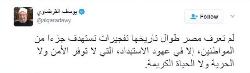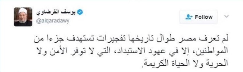 وقال القرضاوي في التغريدة التي قام بحذفها فيما بعد: "لم تعرف مصر طوال تاريخها تفجيرات تستهدف جزءا من المواطنين، إلا في عهود الاستبداد، التي لا توفر الأمن ولا الحرية ولا الحياة الكريمة"، وذلك في إشارة إلى الهجمات التي استهدفت الأقباط.
