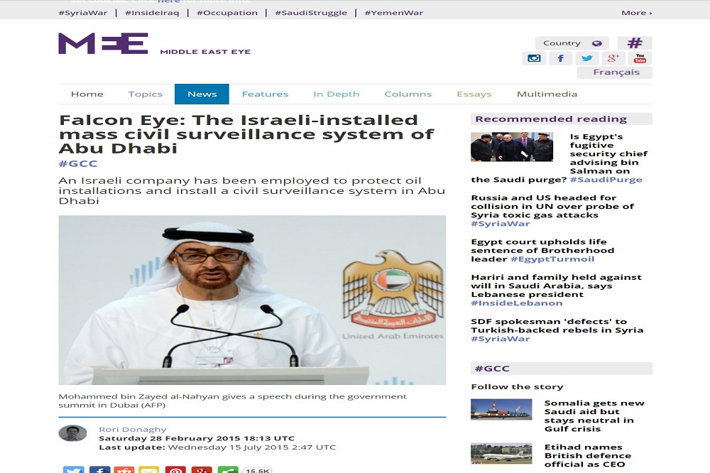 وقد تعاقدت السلطات الإماراتية، وفقا لما ذكرته مصادر متخصصة في مجال المعلومات البيئية، تعمل بشكل وثيق مع الشركات المعنية، مع شركة أمنية تملكها إسرائيل لتأمين منشآت النفط والغاز في دولة الإمارات العربية المتحدة، فضلا عن إنشاء شبكة مراقبة مدنية فريدة في نوعها عالميا في أبوظبي وهذا يعني أن "كل شخص يتم مراقبته من اللحظة التي يغادرون فيها وعودتهم إلى اللحظة التي يعودون إليها"، وفقا للمصدر.