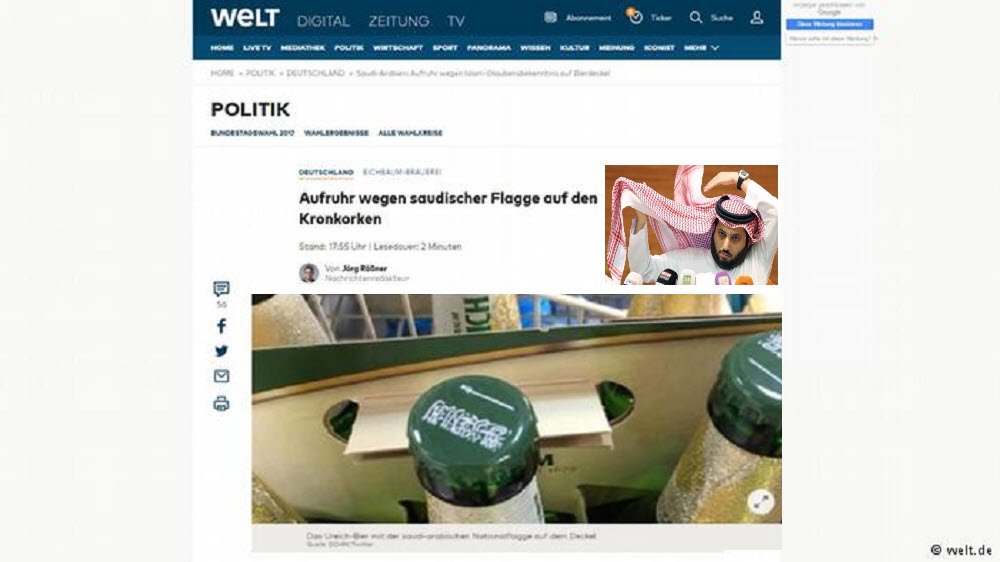 نشرت صحيفة فيلت الألمانية صوراً لزجاجات مشروبات كحولية ظهرت في الأسواق الألمانية وقد وضع عليها علم السعودية، وهو ما أثار جدلاً داخل ألمانيا. ووفقاً للصحيفة الألمانية فإن شركة Eichbaum قامت بوضع أعلام 32 دولة مشاركة في بطولة كأس العالم لكرة القدم المقامة في روسيا يونيو/ حزيران المقبل على أغطية زجاجات البيرة التي تصنعها.