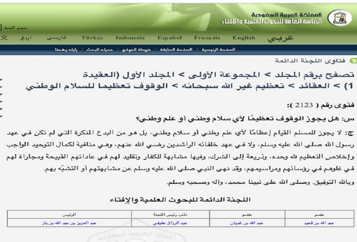 احد المغردين قال في رد على ما نشر من فتح التحقيق معهمها " وقد يكون مامنعهم فتوى الشيخ بن باز وهي تمثل الرأي الرسمي ويجب مراجعة هذه الفتوى وسن قانون يوضح كيفية التعامل مع النشيد الوطني والعلم السعودي ثم نحاسب المخالف بعدها ".