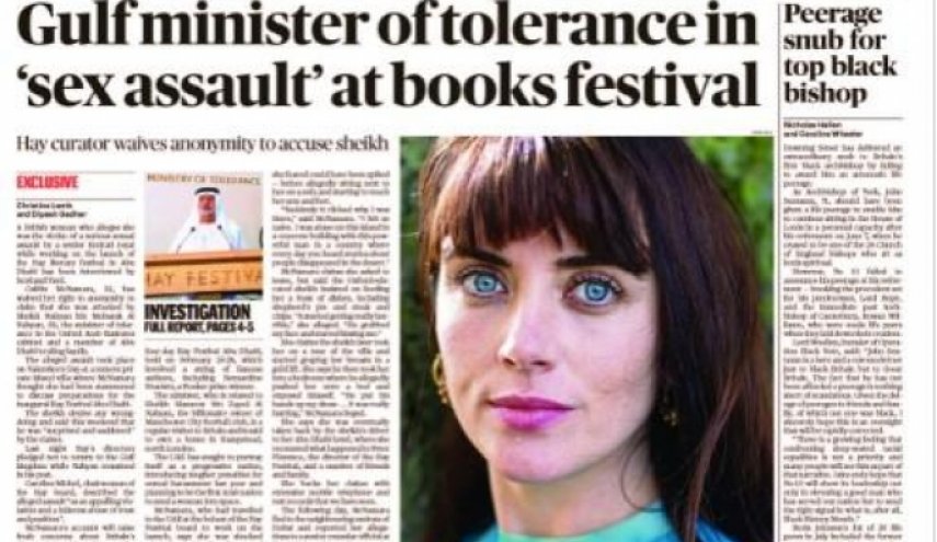 وتحت عنوان "الاتهامات بالاعتداء الجنسي تشوب مهرجاناً أدبياً في أبوظبي"، وصفت الصحيفة الواقعة بأنها "قنبلة صغيرة" تسببت لا محالة في بعض الهزات في قصور الخليج (الفارسي).