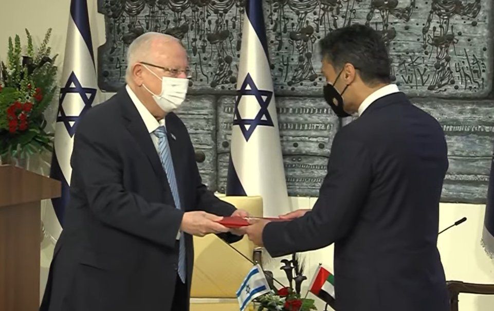 السفير الإماراتي الأول لدى كيان الاحتلال الاسرائيلي محمد محمود آل خاجة يقدم أوراق اعتماده للرئيس رؤوفين ريفلين