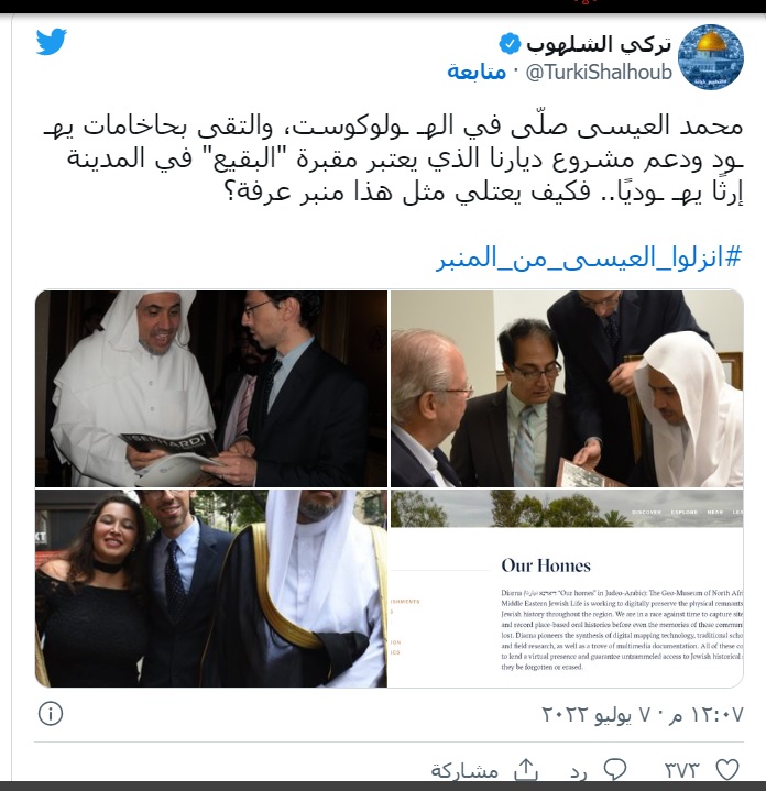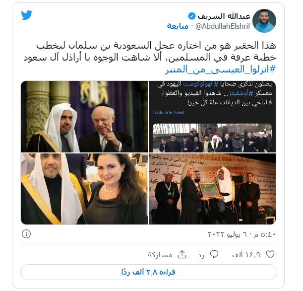 أثار اختيار عضو هيئة كبار العلماء والأمين العام لرابطة العالم الإسلامي، الشيخ محمد العيسى، خطيبا ليوم عرفة في السعودية، جدلا واسعا على مواقع التواصل الاجتماعي.