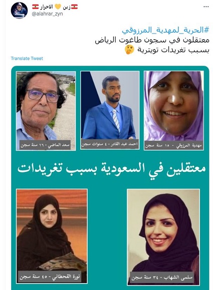 "زين الاحرار" قال: #الحرية_لمهدية_المرزوقي معتقلون في سجون طاغوت الرياض بسبب تغريدات تويترية.