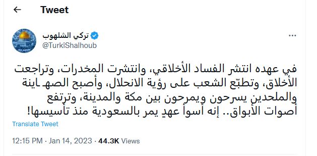 هاجم الكاتب السعودي تركي الشلهوب انحلال وانحطاط السعودية في زمن حكم محمد بن سلمان