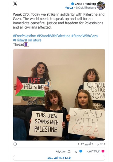حيث كتبت غريتا تونبرغ: "اليوم نضرب تضامناً مع فلسطين وغزة. يحتاج العالم إلى التحدث والدعوة إلى وقف فوري لإطلاق النار وتحقيق العدالة والحرية للفلسطينيين وجميع المدنيين".