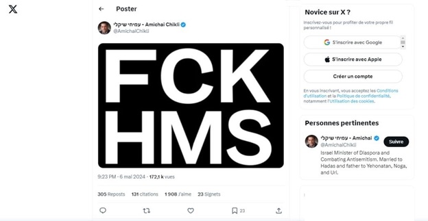 نشر وزير الشتات الإسرائيلي عميحاي شيكلي مساء يوم الاثنين تدوينة على منصة "إكس" تضمنت ألفاظا بذيئة وذلك عقب إعلان حركة حماس الموافقة على مقترح وقف إطلاق النار في غزة.
