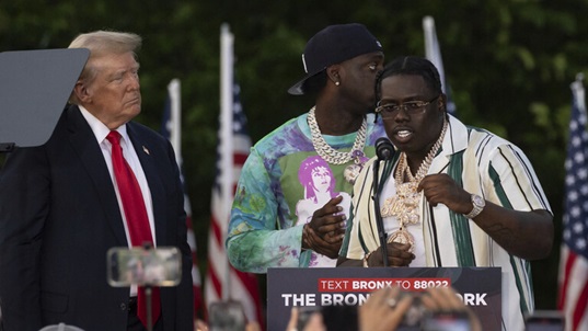 دعا الرئيس الأمريكي السابق دونالد ترامب مغنيي "راب" متهمين في قضية تتعلق بعصابة كبيرة إلى المسرح، في تجمع لدعم حملته الانتخابية هذا الأسبوع بمقاطعة ذا برونكس.