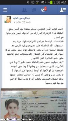 طفلة يمنية بسبب إسمها(فدك الزهراء) تمنع من دخول اليمن