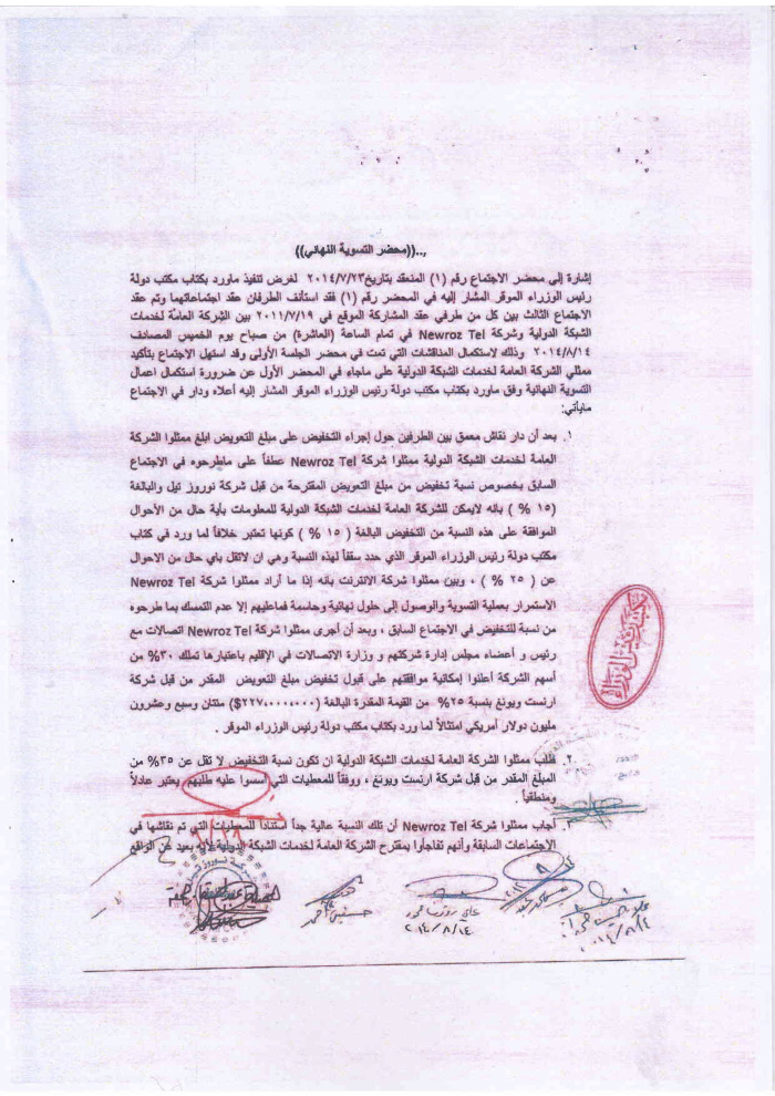 حيث به وثيقتين ، ألأولى الصفحة الأولى من محضر التسوية والذي تطالب به شركة نوروزتيل بدفع تعويض قدره ٢٢٧ مليون دولار، وموافقة رئيس ألوزراء بدفع تعويض أقل بمقدار ٢٥٪ أي حوالي ١٧٠ مليون دولار. والوثيقة الثانية كتاب موجه من مكتب رئيس الوزراء إلى وزارة ألمالية لدفع مبلغ أكثر من ١٧٠ مليون دولار إلى شركة نوروزتيل.
