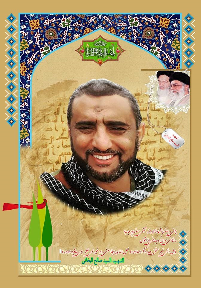 إنها صورة رمزية للشهيد، ولكنها أصبحت مشهداً مكملاً للصورة الإنسانية، التي يمتلكها هذا البطل، سيما وأنها حفظت عمق الألفاظ التي كتبت على الصورة، مثل كلمة عطاء، مسيرة، وجهاد، رجال أحرار، وهيهات منا الذلة، على خُطى الحسين، وجميعها عبارات تضفي عليها الهيبة والقداسة، التي لا ينالها إلا ذو حظ عظيم، والبخاتي أحب الله كثيراً، وأحبه الله ورسوله حتى نال الشهادة، التي يتمناه الرجال الأحرار أمثاله.