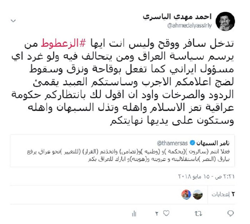 بالامس القريب كان اتباع البعث والصرخيون هم المندسون بينكم في تظاهرات المنطقة الخضراء يطلقون ذات الشعار لضربك باخوتك في البيت والاقليم الشيعي واليوم يعيدون ذات السيناريو ليضربوك بالقوائم الاخرى وفعلوها في الزيارة الشعبانية واحداثها وجندو من جندوه ورفع صور والدك الشهيد وصورك للايحاء بانهم من يحرق ضريح الامام الحسين ويثير الفتنة وتصدينا لهم اعلاميا وانا اول من فضحهم في تلك الليلة الموحشة وهم من فعلها من قبل وكان الضاري يقترب منك ليبعدنا عنك ونجح حتى كشفته بنفسك وها هي سيناريوهاتهم يكرروها بكلمات حق يراد بها الفتنة وتفريقك عن اهلك فالله الله الله بنفسك وتاريخ ابائك واجدادك والعراق وفعلها صدام قبلهم مع ابيك الشهيد وقتله اللعين ابن اللعين ليلصق التهمة بالحوزة وانت تعلم ذلك واستخدم نفس اسلوب المديح بدواعي التشويه والان يكررون الفعل معك ومع الاسف ينساق البعض للفتنة دون وعي وتبصر فهل يعقل ان يمتدحك السبهان وهو من هو لاينكر حقده على شيعة الله ورسوله وهو واسياده من قطع راس الشهيد النمر واخوته وهو واسياده من يعلنها حرب على حزب الله ويدعمون ترامب في صفقة القرن وهم يدفعون لترامب المليارات ويبيدون اخوتك في اليمن المظلوم والبحرين الجريحة ووووو ان عددت لك كل المظالم لن يكفي الورق ولا الساعات واكتفي بهذا .