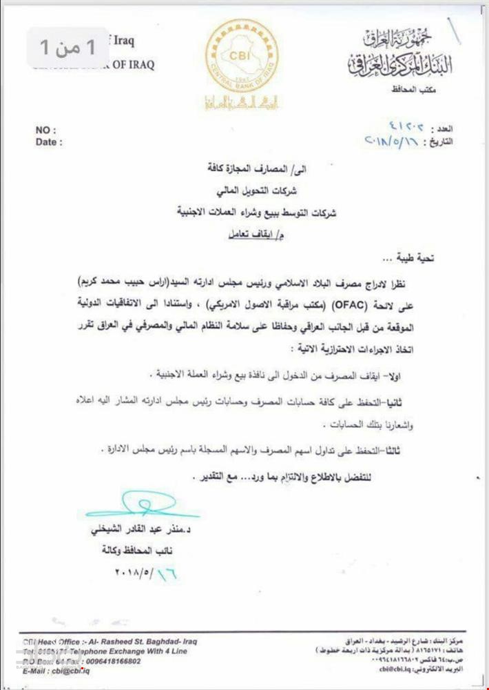 واظهرت وثيقة القرار وجهها البنك الى المصارف المجازة كافة، وشركات التحويل المالي شركات التوسط ببيع وشراء العملات الأجنبية، اتخاذ اجراءات بحق المصرف وكريم أكد البنك أنها تاتي وحفاظا على سلامة النظام المالي والمصرفي في العراق.وتضمن الاجراءات ايقاف المصرف من الدخول الى نافذة بيع وشراء العملة الأجنبية، والتحفظ على كافة حسابات المصرف وحسابات رئيس مجلس ادارته اراس حبيب، والتحفظ على تداول اسهم المصرف والأسهم المسجلة باسم رئيس مجلس الادارة... انتهى الخبر .