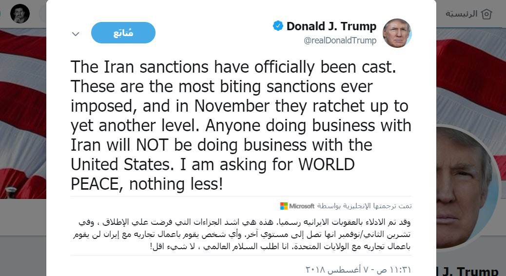 قال ترامب في تغريده له اليوم الثلاثاء "وقد تم اقرار العقوبات ضد ايران رسميا. هذه هي اشد العقوبات التي فرضت علي الإطلاق ، وفي تشرين الثاني/نوفمبر ستصل إلى مستوي آخر. وأي شخص يقوم باعمال تجاريه مع إيران لن يقوم باعمال تجاريه مع الولايات المتحدة. انا اطلب السلام العالمي ، لا شيء اقل!".