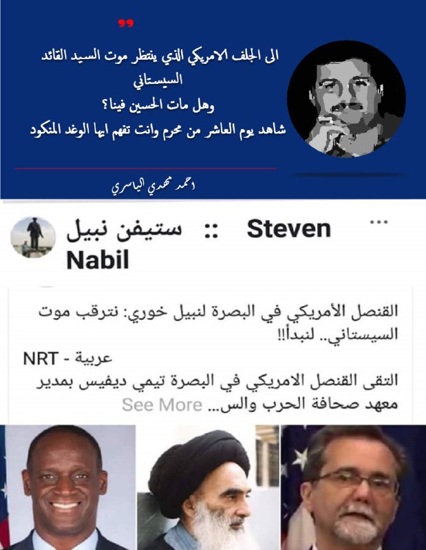 قبل الخبر اعلاه انتشر خبر تطاول الارهابي القنصل الامريكي في البصرة تيمي ديفيس وقوله لمدير معهد صحافة الحرب والسلام نبيل خوري بمبنى السفارة الامريكية في المنطقة الخضراء ببغداد "نترقب موت السيستاني.. لنبدأ" وانتشر هذا الخبر اكثر من خبر لقاء سليماني - ماكغورك وتبناه في النشر عميل السفارة والادارة الامريكية وبوقها ستيفن نبيل الذبابة الالكترونية الفاعلة والنشطة كالقردة المصابة بالجرب للترويج للفتن التي تصب في صالح الولايات المتحدة الامريكية بثمن بخس وتابعت موقع السفارة والقنصلية ولم ينشر بيان نفي لهذه الاسائة المتعمدة والوقحة منذ نشرها حتى الساعة مايعني تبني القنصل والسفير والادارة الامريكية لهذه الوقاحة والتطاول على رمز عظيم من رموز العراق والاسلام في العالم ما استوجب الرد الصاعق من قبل حكومتنا الفاشلة والساكتة عن الكثير من الاسائات ولاني لا اعول عليها انقل الطلب بعد هذا التطاول السافر للقنصل الامريكي في البصرة الى الحكومة الجديدة والشرفاء من اعضاء مجلس النواب الجديد وصار لزاما عليهم وعلى احرار الشعب العراق #طرد_القنصل_الامريكي_من_البصرة وصار من الواجب #غلق_القنصلية_الامريكية_وكر_الارهاب_في_البصرة لا بل هو واجب مقدس .