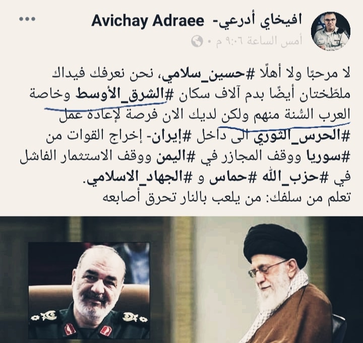 تخيل معي؛ أفيخاي يدافع عن سنة الوطن العربي ويخاف عليهم من إبادتهم بتعيين سلامي قائداً للحرس الثوري!